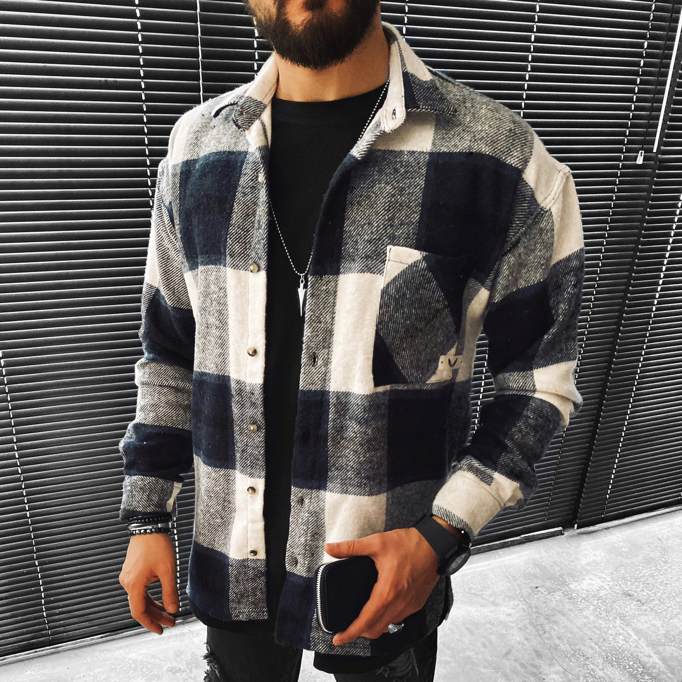 Casual Large Plaid Textured Button Long Sleeve Jacket